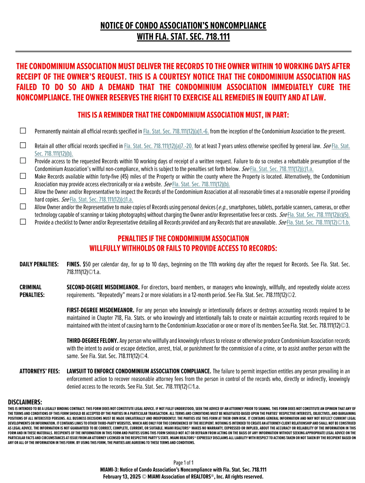 Notice of Condo's Association's NoncomplianceOfficial notifications for unit owners